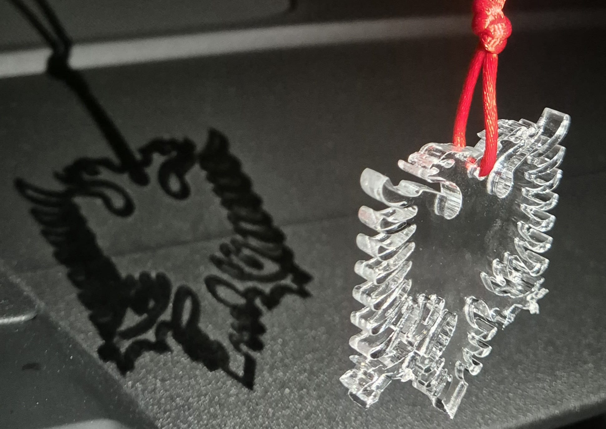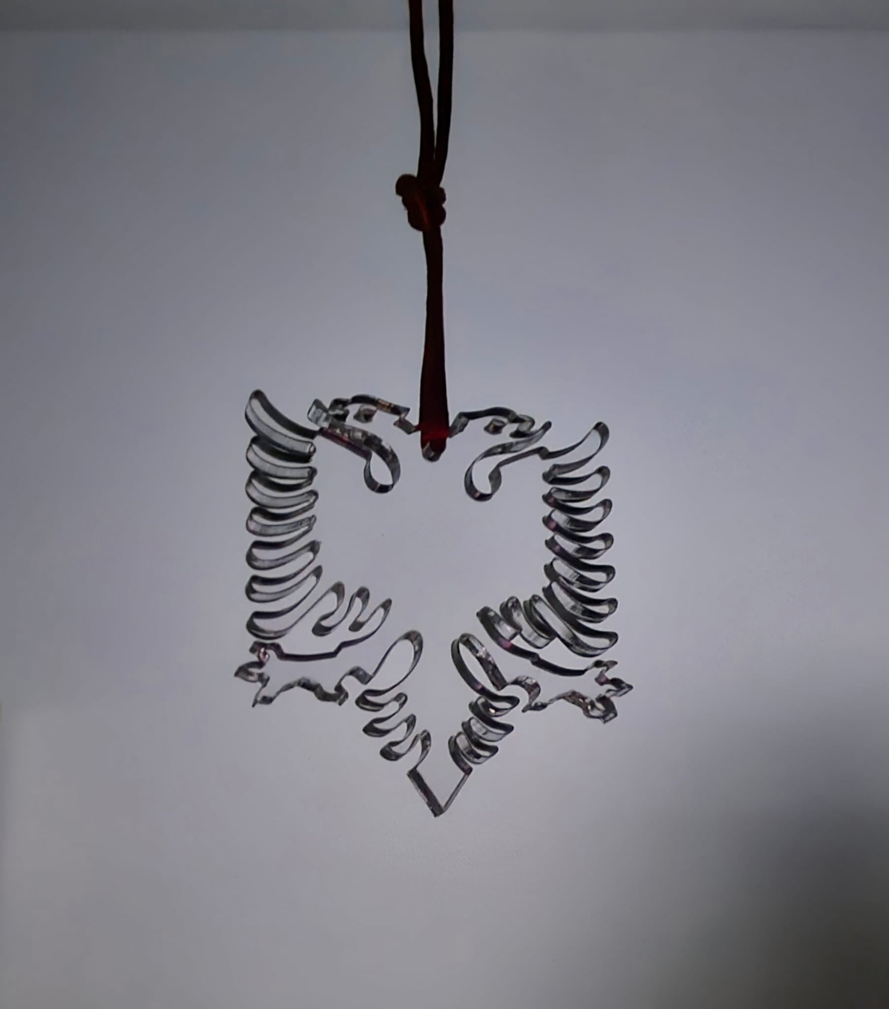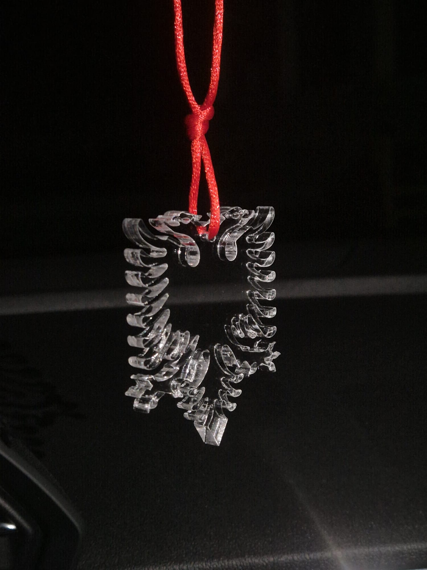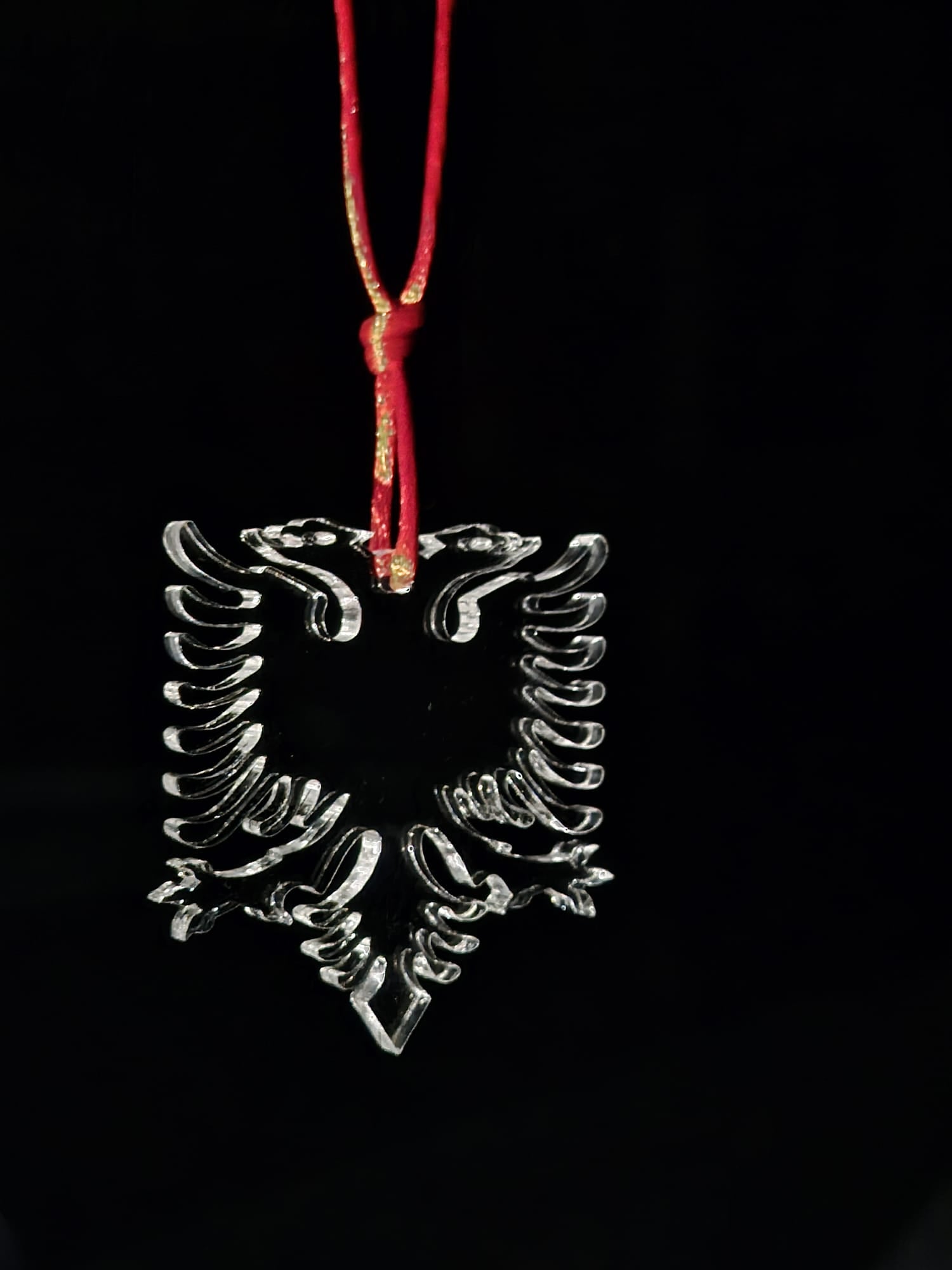 Albanischer Auto-Anhänger aus Plexiglas. Der albanische Adler ist ein schwarzer Doppeladler auf rotem Hintergrund und das nationale Symbol Albaniens. Er stammt aus dem Mittelalter und wurde von Skanderbeg, dem albanischen Nationalhelden, als Wappen verwendet. Heute repräsentiert er die Unabhängigkeit, Stärke und Einheit der albanischen Nation und ist auf der Flagge Albaniens sowie in vielen kulturellen und politischen Kontexten zu sehen.