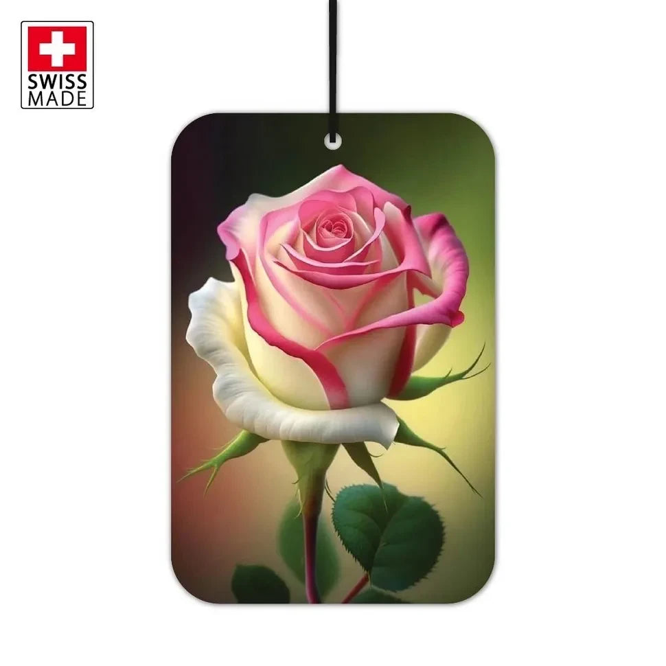 Verleihen Sie Ihrem Auto Eleganz mit unserem Schweizer Lufterfrischer: Schöne rosa-weiße Rose für erfrischenden Duft und zarten Charme bei jeder Fahrt.