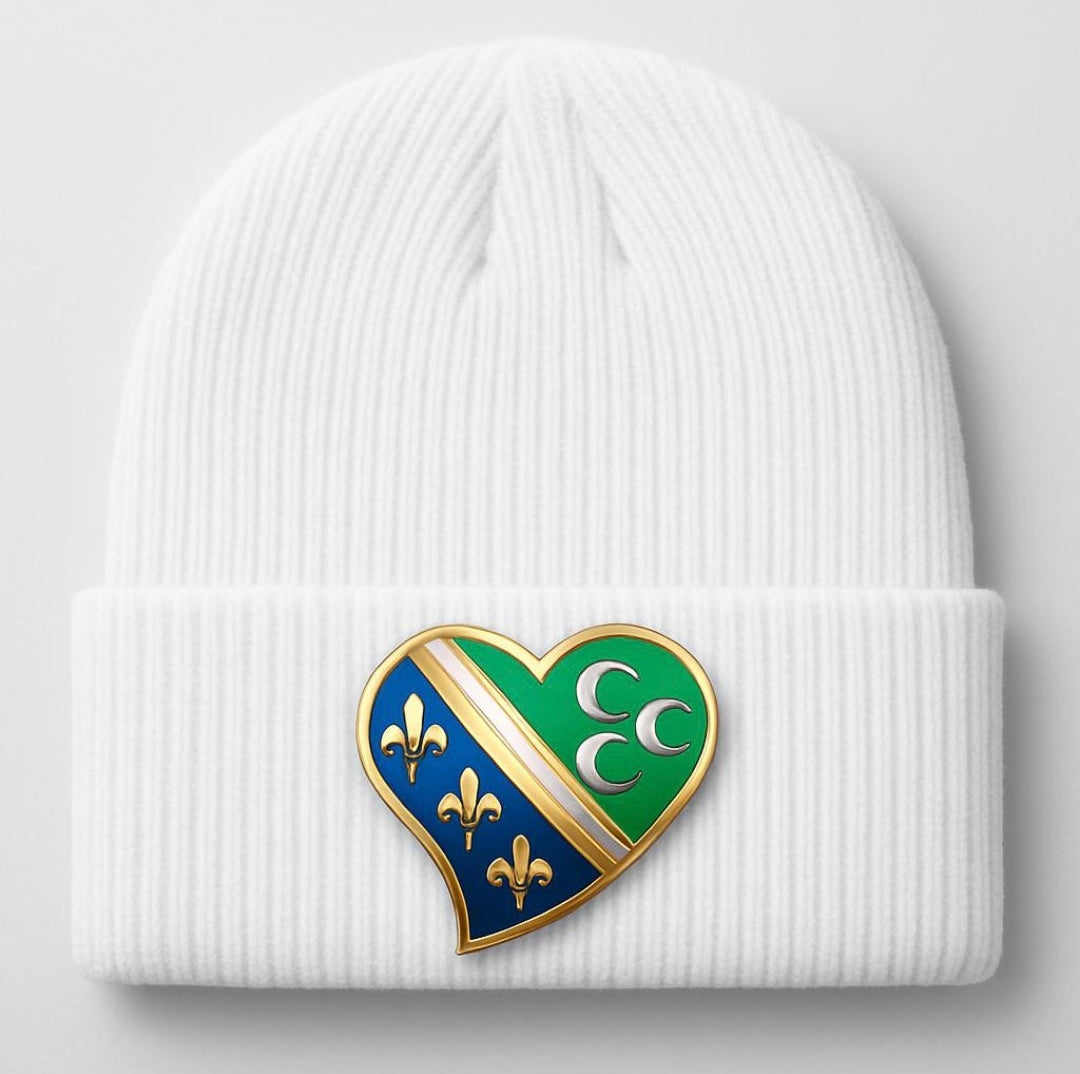 Diese Wintermütze präsentiert sich in einem schlichten, eleganten Weiß und bietet durch ihr geripptes Strickdesign eine angenehm warme Passform. Auf der Vorderseite befindet sich ein hochwertiges Herz-Emblem in den Farben des Sandžak, verziert mit goldenen Akzenten für einen edlen Look. Die Kombination aus Blau, Grün, Gold und den traditionellen Symbolen macht die Mütze zu einem besonderen kulturellen Statement. Dank ihres minimalistischen Designs lässt sie sich vielseitig kombinieren und eignet sich ideal für kalte Tage. Eine perfekte Mischung aus Stil, Identität und Komfort.